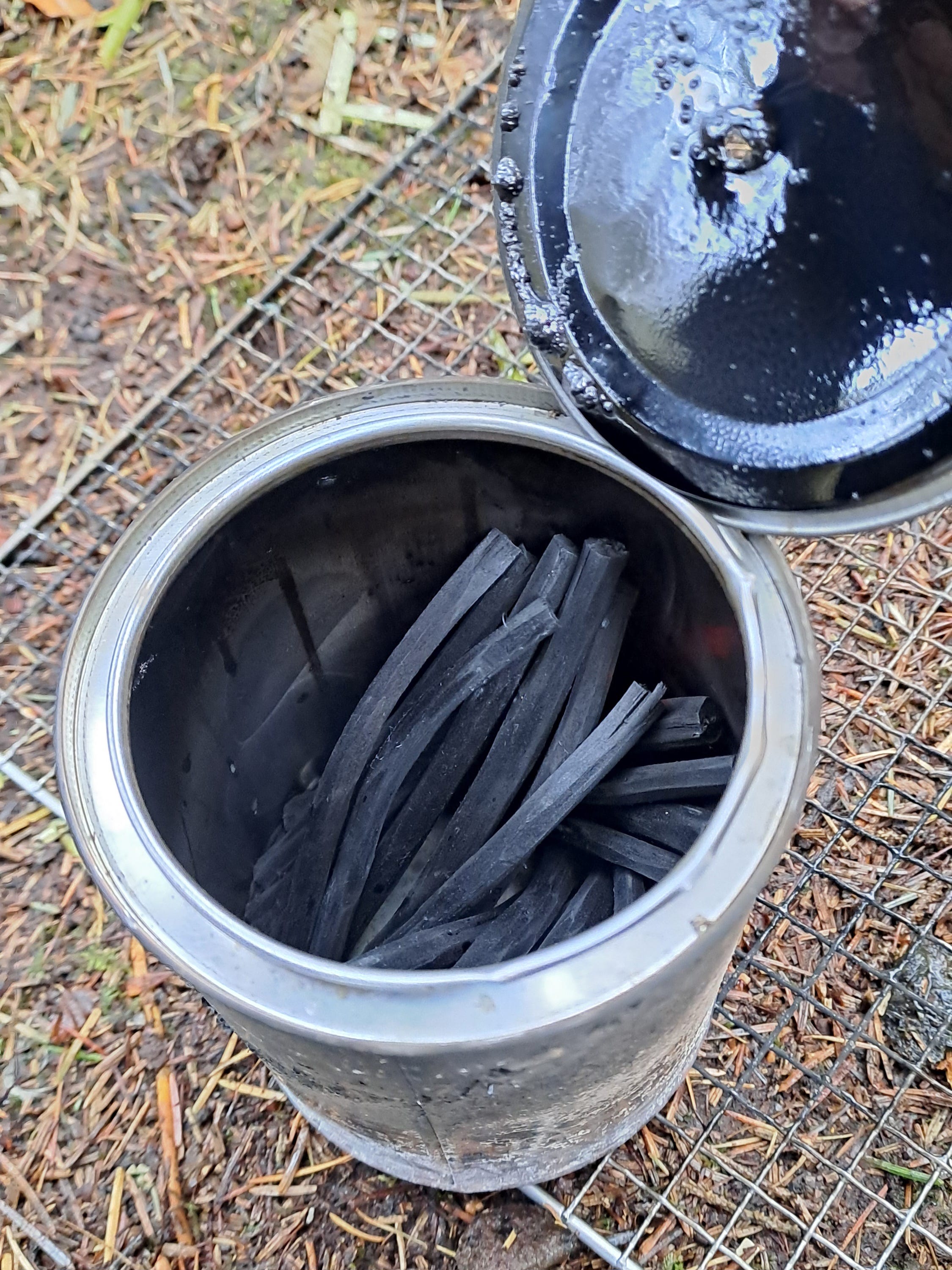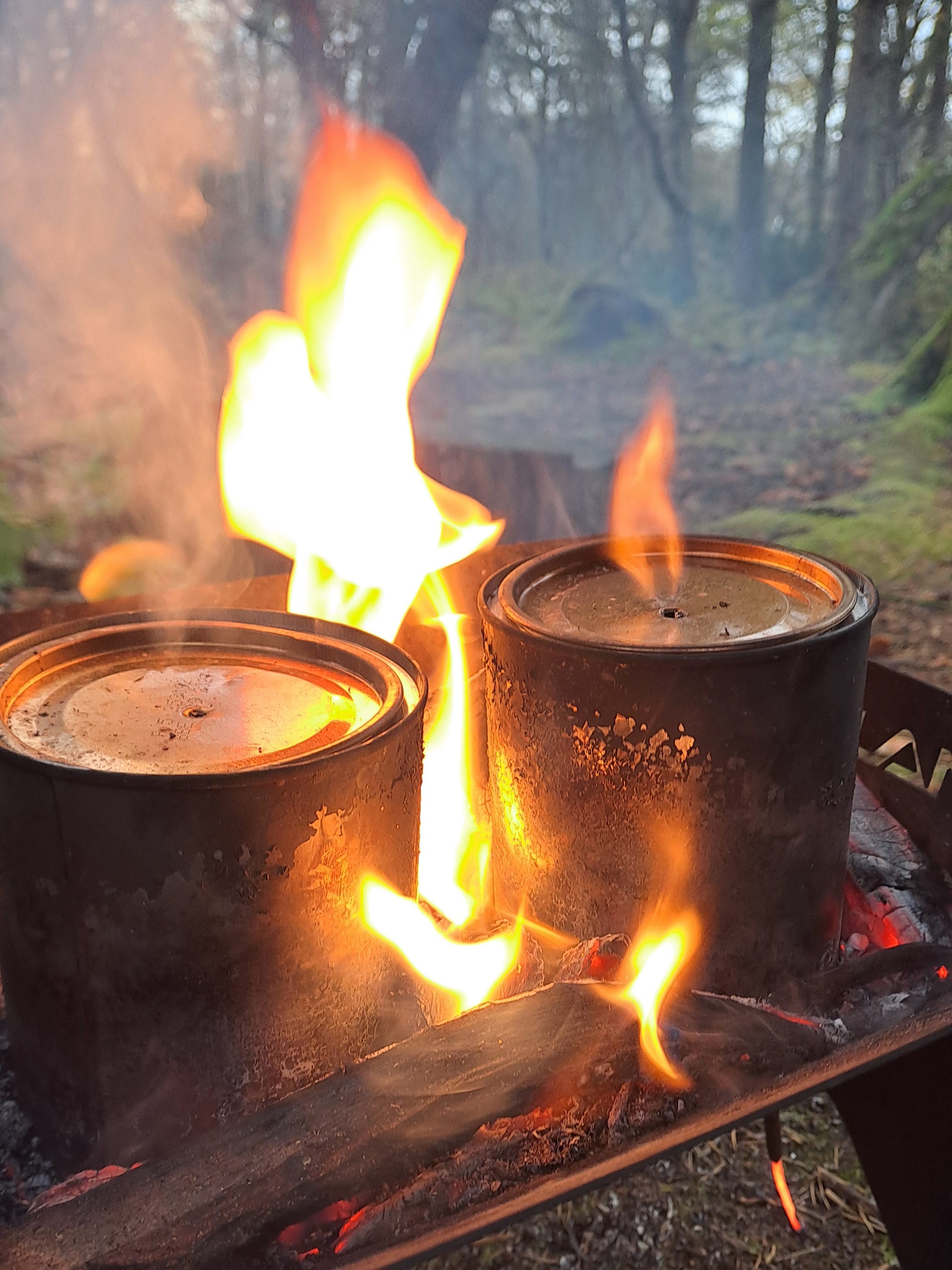 Now the waiting begins! It took about an hour to make our charcoal in syrup tins – smaller tins will be faster, while larger ones will take longer. After 15 minutes or so we started seeing smoke coming out of the hole in the lid – this is good!
