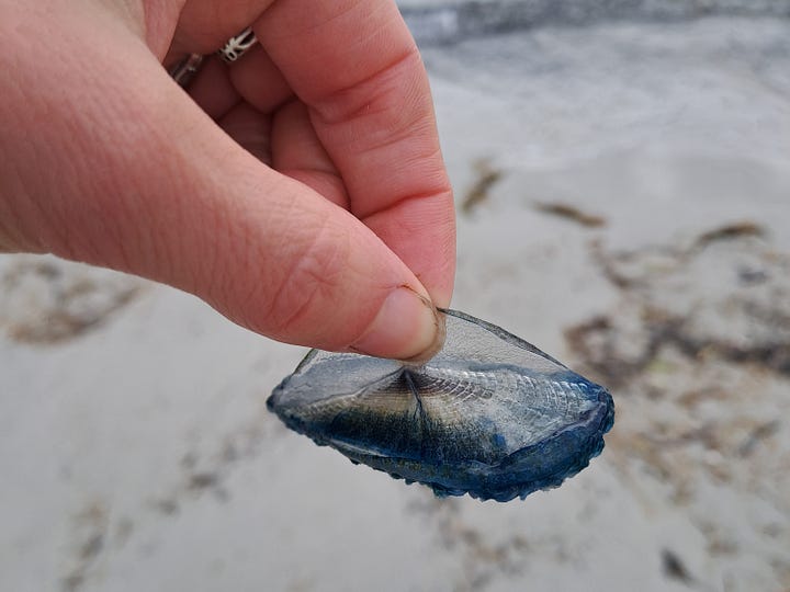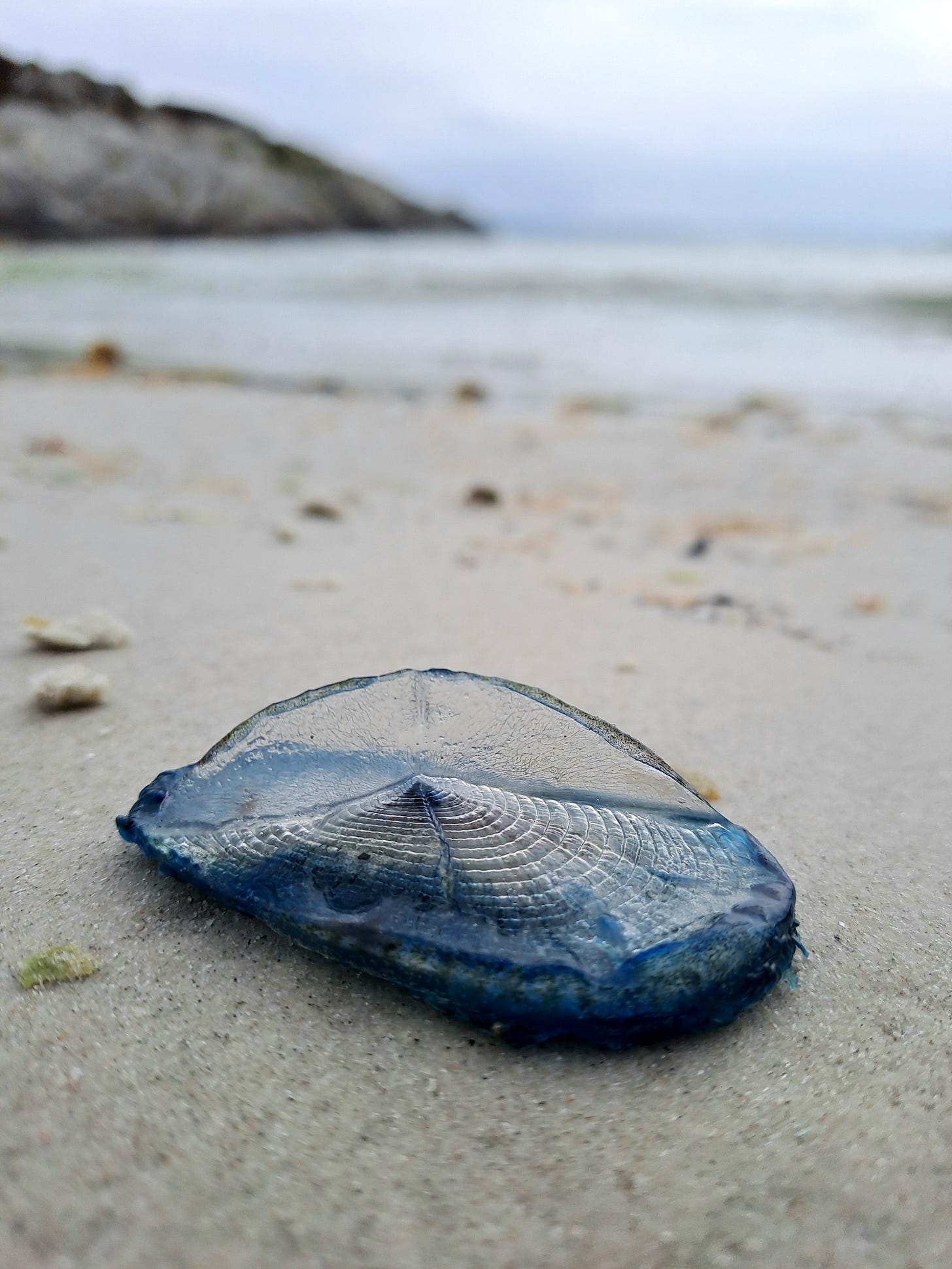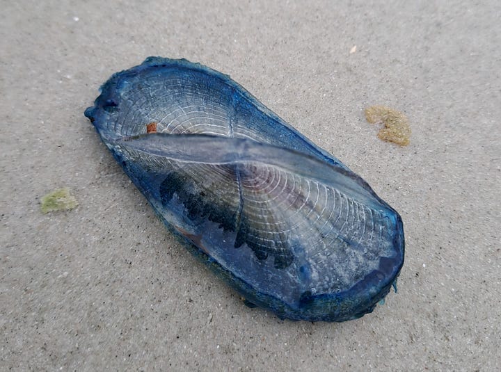 This is quite a fresh specimen as it still has its beautiful blue colour; they turn transparent and papery when they die and dry out. They can be up to 10cm long and when alive, have short tentacles that hang downwards. They drift about in large groups, using these dangly tentacles to capture their planktonic prey.