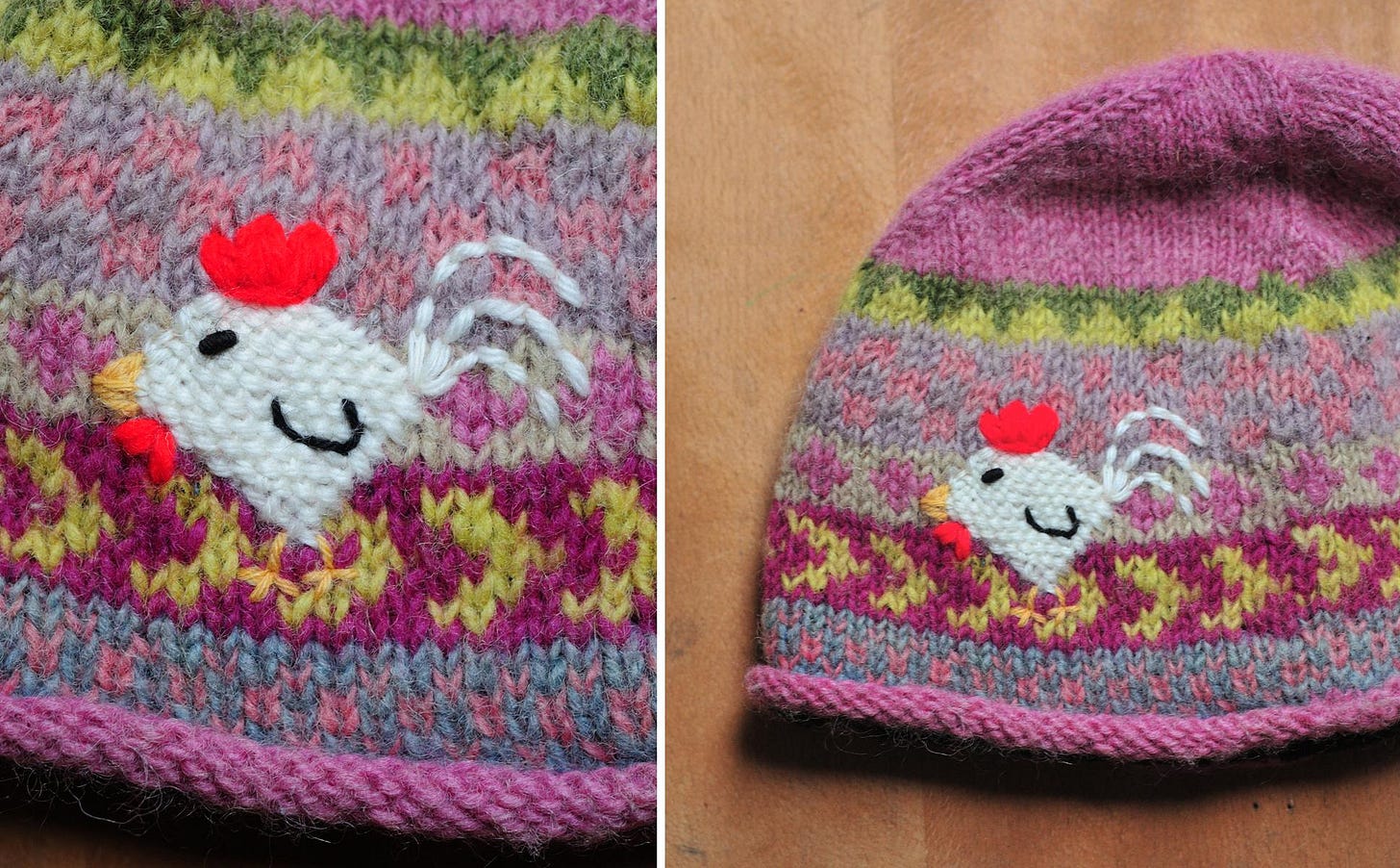But my favourite swap ever? A couple of years ago we had issues with our broadband, and had no internet in the house for several weeks. On Friday mornings during this time I would cycle along to a friend’s house with my laptop to check bank accounts, send invoices, and do all the other fun stuff related to running a business that requires access to the internet. In return I did a bit of mending for her. It makes me smile every time I see her wearing her woolly hat with the chicken on it, that I darned to cover up a hole.