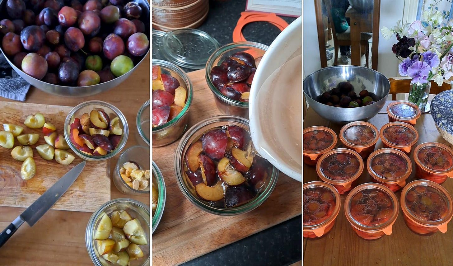 Sunday evening was spent chopping some of the 3.5kg of plums I picked that afternoon, then bottling a load of jars of them in a light syrup. Monday afternoon was spent in much the same way, after I harvested another two kilograms of them. In a few days time I’ll make a small batch of jam. I’m trying to move away from making so much jam from my fruit harvests (it just uses such a lot of sugar!) so bottling – or water-bath canning, depending on where you are in the world - has been my method of choice for preserving fruit over the last couple of years. When it’s preserved in that way it can still be used in pies and crumbles during the winter, and it is so nice to be able to enjoy a jar of summer sunshine spooned over porridge on a cold dark morning. But let’s not think about winter yet – I still have a tree full of plums to deal with! Just try not to stand on any of the drunken wasps crawling around on the ground...