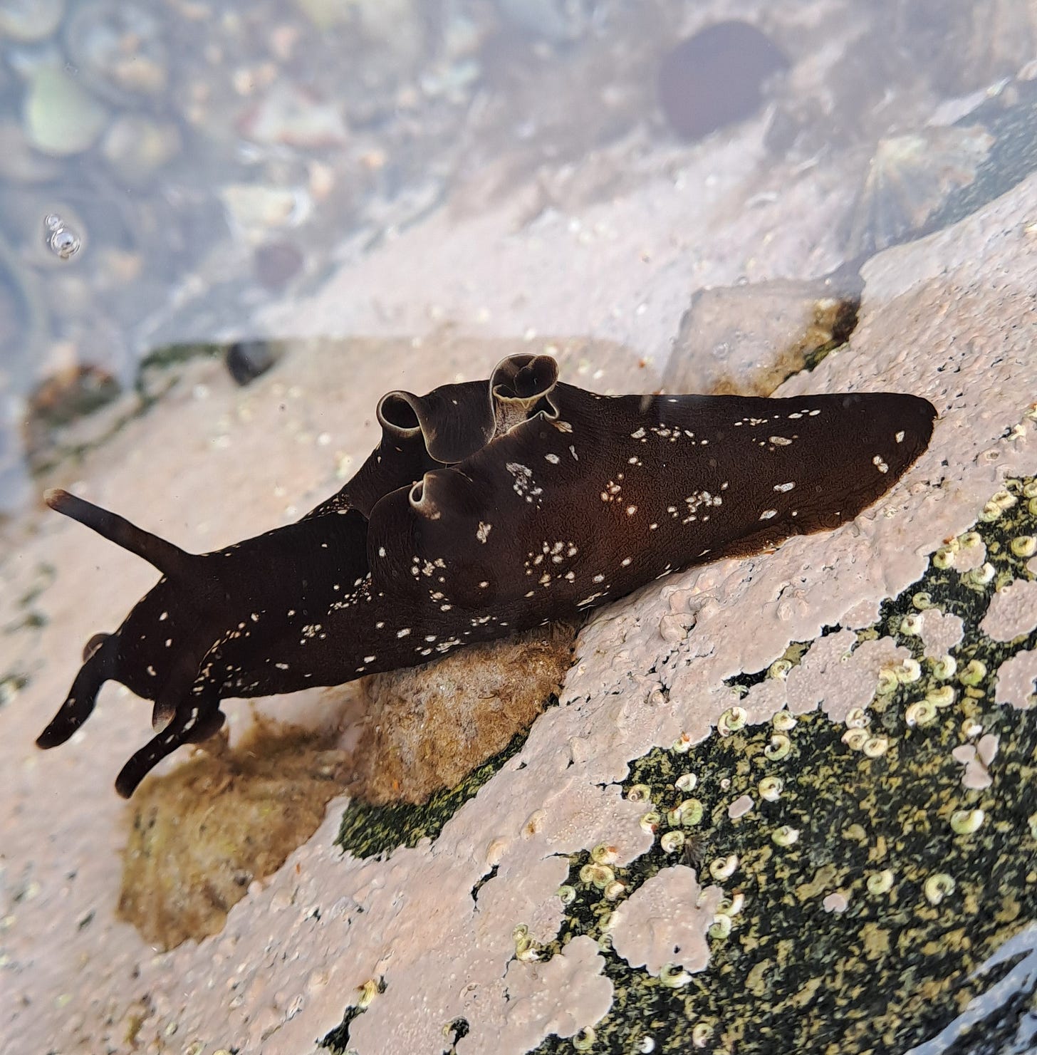 Mission complete, we headed back to the house, stopping to admire some Dotted Sea Hares in a rockpool on the way. Sea Hares (Aplysia punctata) are a species of sea slug found around most of the coast of Britain and Ireland. We often see large numbers of them in spring, when they come closer inshore to breed. The one in the picture below really was living up to both its common and scientific names, being one of the spottiest individuals I’ve ever seen. (Punctata is a term used in biology to describe organisms or structures that have many spots, dots, or small pores.)