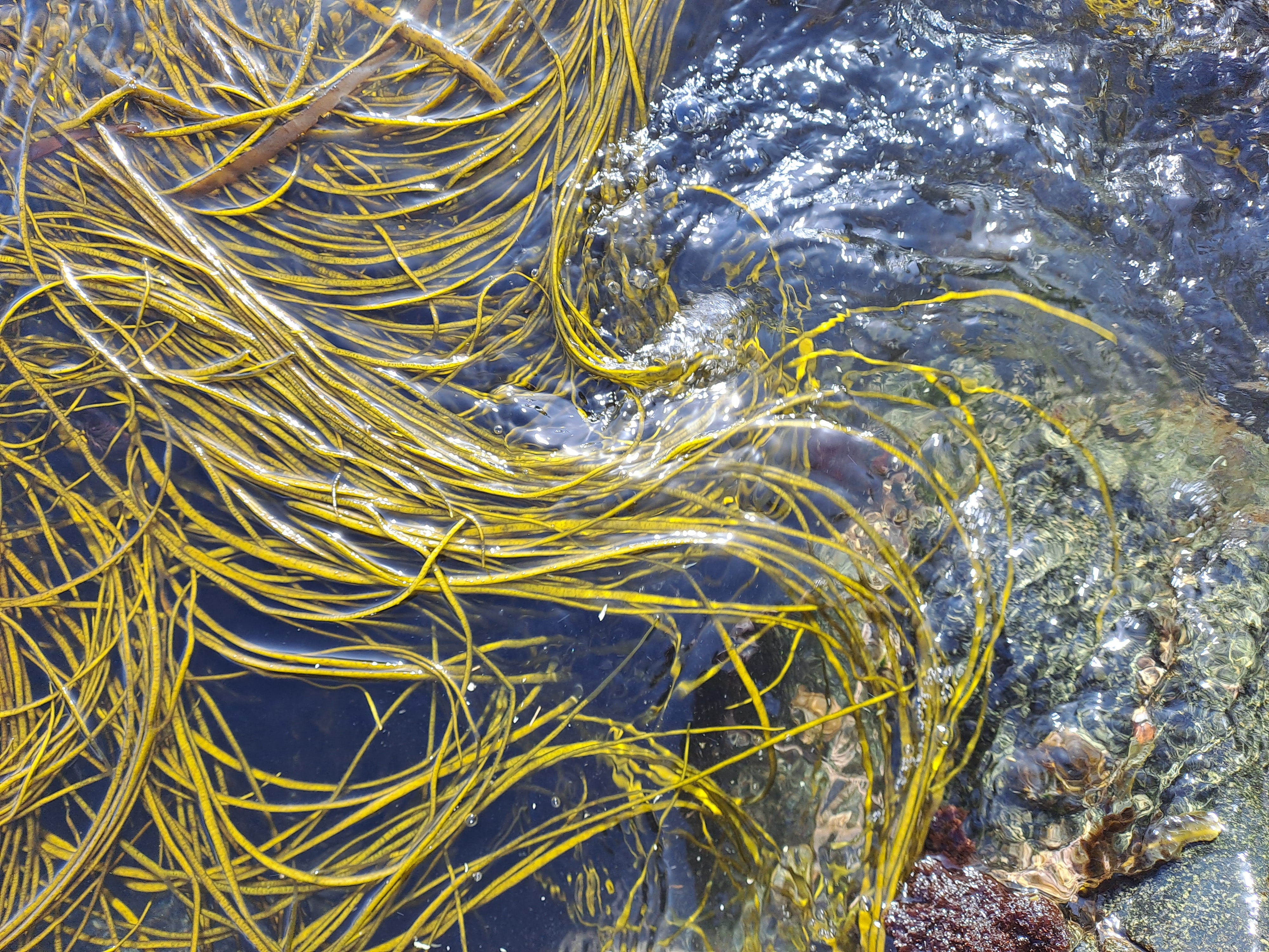 The seaweed has two different stages. The first of these is a button-shaped thallus measuring a couple of centimetres in diameter, which is attached to the rocks by a short stem, know as a stipe. This “button” can take up to two years to reach maturity. From it, two long strap-like reproductive fronds are formed in the autumn – the second stage. These grow quickly from February to May, and can reach a length of up to two metres. These long fronds are the “spaghetti” that we were looking for, although since the fronds are slightly flattened I suppose it would be more accurate to call it “sea linguini”...2