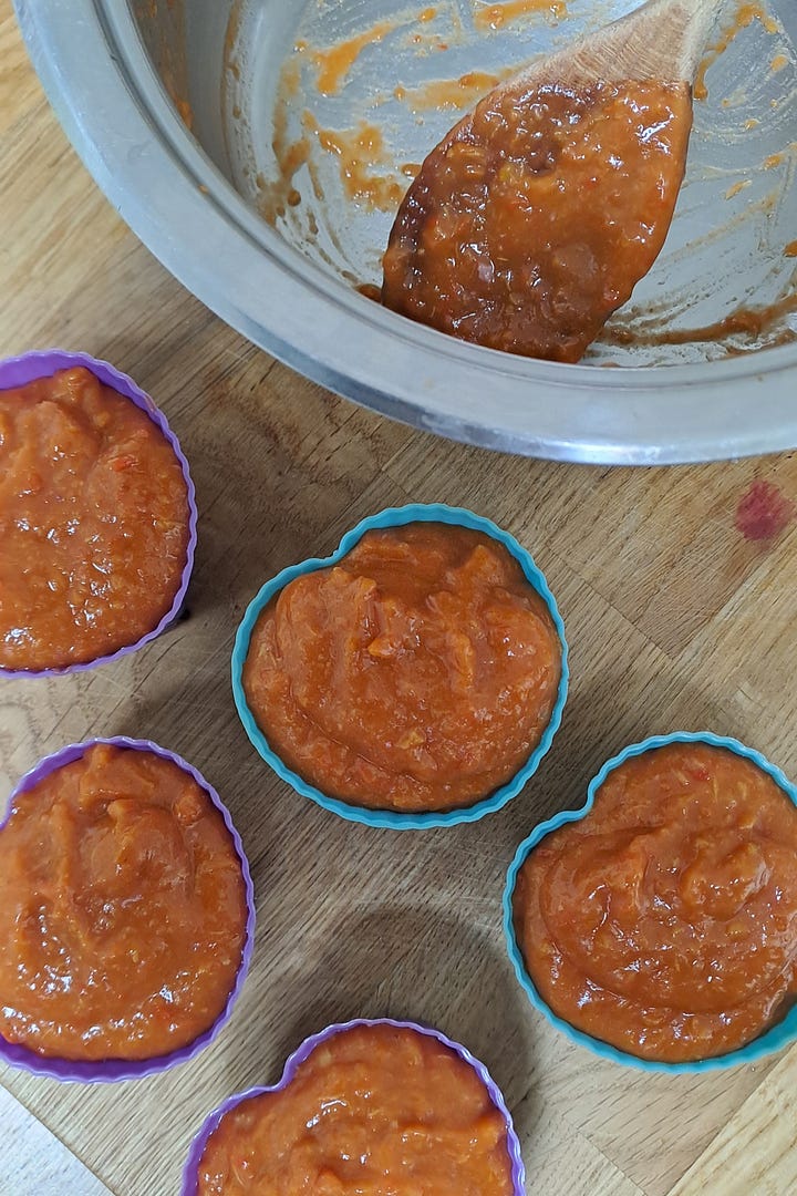 Friday night is homemade pizza night in our house, and I was keen to try out my new “nomato” sauce. Would it pass the ultimate test – would my son detect a difference in his pizza?! I rolled out the dough, spread on the puree, and added various other things from the garden (chopped spinach and courgette this time) before topping it with cheese and some freshly-picked sliced tomato. Into the oven it went and... success! Both my husband and son ate it quite happily without noticing anything out of the ordinary, and neither of them seemed the slightest bit concerned when I told them!