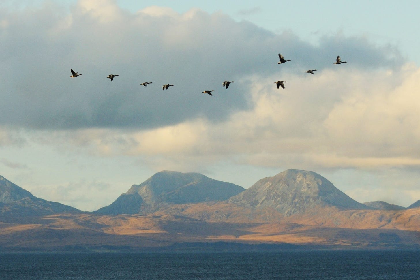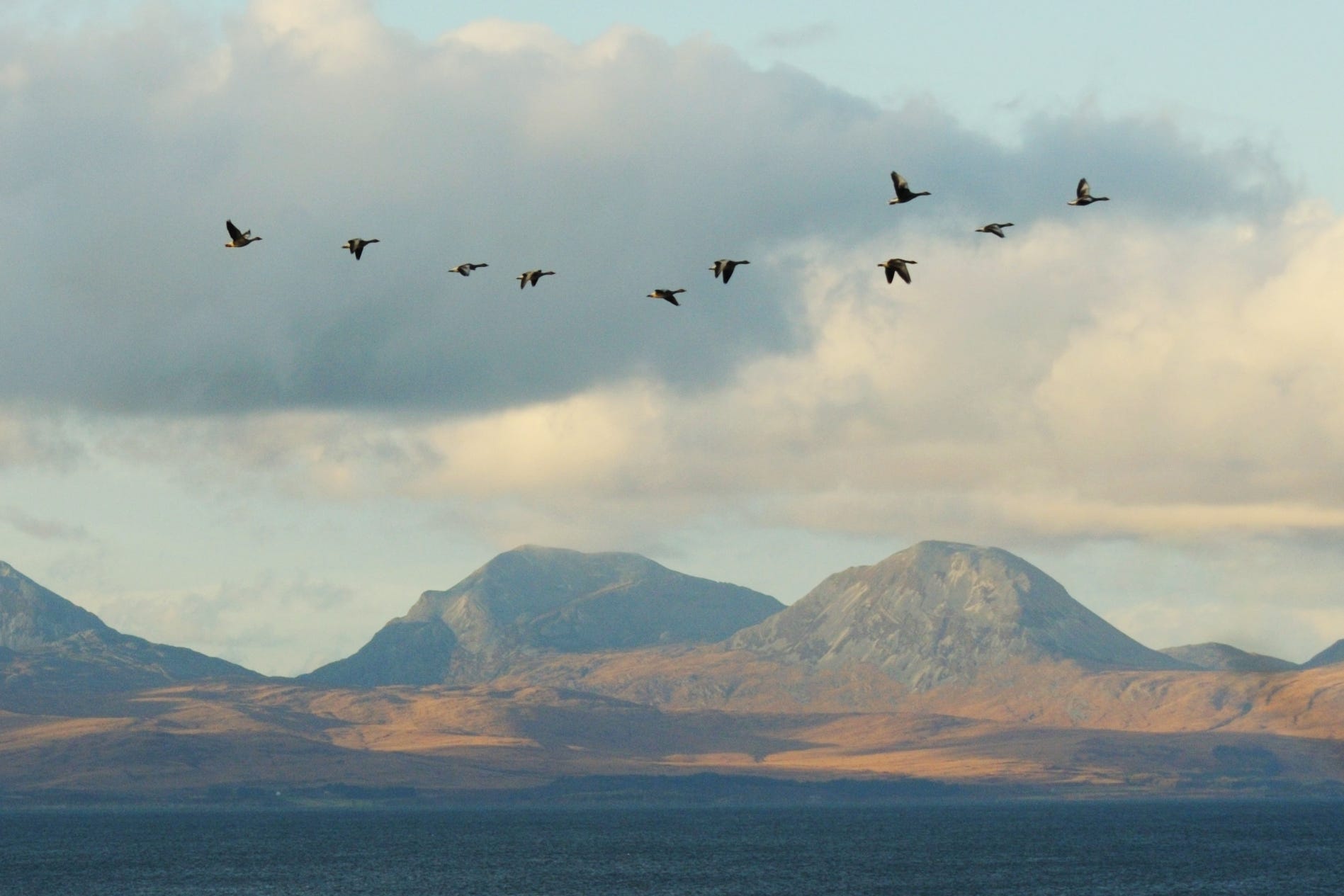 Most of the geese around here are Greylag (Anser anser), with a few Barnacle (Branta leucopsis), Canada (Branta canadensis) and White-fronted (Anser albifrons) thrown in for good measure. Some stay on the island year-round, choosing to both breed and overwinter here. I spotted them incubating their eggs in feather-lined nests amongst the heather; I watched them raise their babies from little fluffballs bobbing about in the harbour, to gangly teenagers, to mini-adults. Numbers have been augmented lately by others from further north, stopping off on their annual migration to warmer climes. For the last couple of weeks I have seen and heard skeins of them flying in to land in the bay as the evening light is fading.